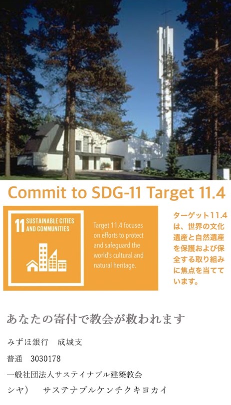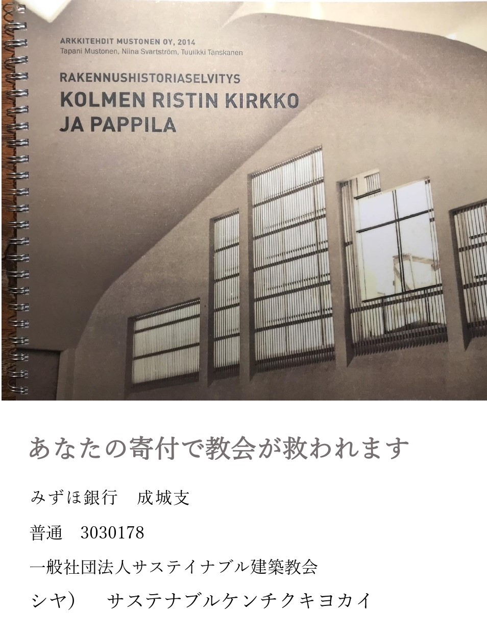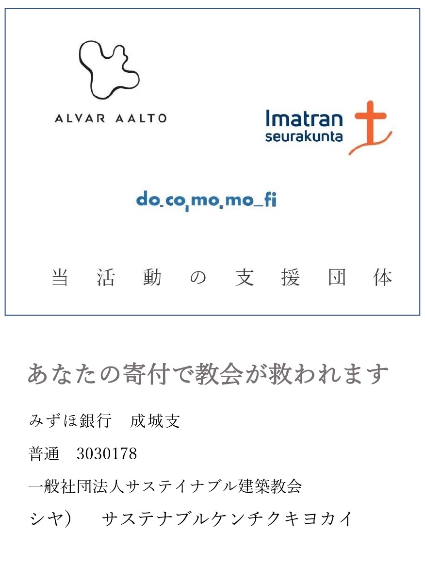 The gradual renovation of the church began already in 2012 under the direction of architect Tapani Mustonen and his skilful team. Unfortunately, fund raising has turned out difficult and slow. For that purpose, a highly appreciated initiative has been launched in Japan by Architect Andrea Hikone. Alvar Aalto Foundation fully supports her campaign and its purposes and hopes the best possible results to the effort.